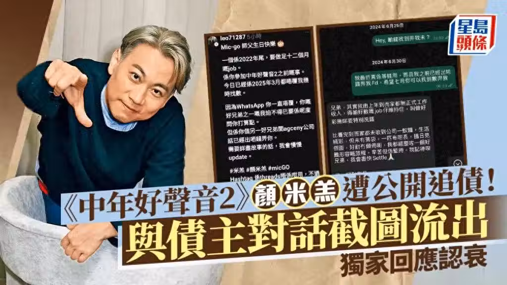 TVB節目《中年好聲音2》季軍顏米羔,一向極多粉絲,於網上人氣持續高企。不過近日他就被朋友於網上公開追債,債主於網上曬出多張與其私信的對話截圖,指顏米羔於2022年12月之後一直拖欠金錢,至去年6月兩度聯絡他,都沒能成功追收欠款。