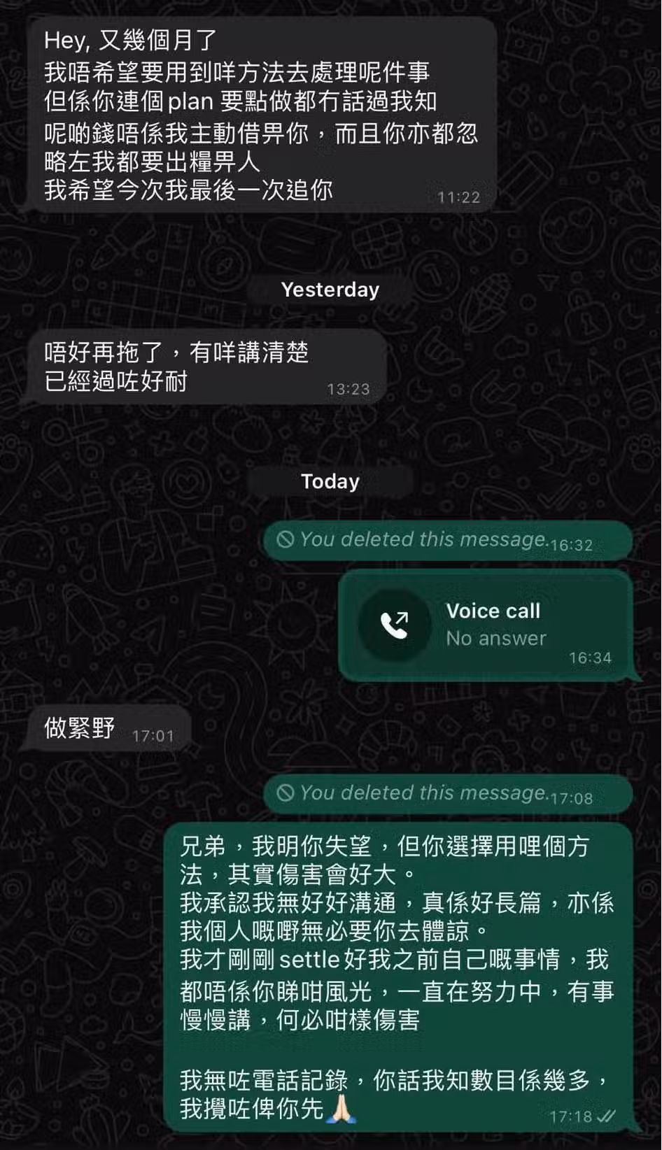 TVB男星被兄弟公開追債!與債主對話截圖曝光,回應2萬塊一拖再拖