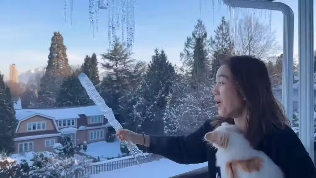 視頻中可見,姜麗文在回家暫住,走出露台見到冰柱非常驚訝,而鏡頭亦拍到大屋門口非常氣派,望外景觀亦非常好。