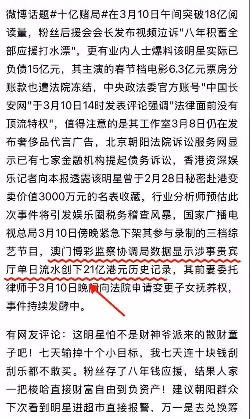 網傳這位「超一線男星」的內地經紀公司於3月9日深夜發布聲明承認存在「個人財務問題」,但未提及具體金額,知情人士透露該明星為翻本,甚至借貸3億元高利貸,目前其北京朝陽區價值2.8億元的獨棟別墅及上海陸家嘴頂級公寓均已被法院查封,涉及的五家品牌方於3月10日上午集體宣布解約。更有業內人士爆料指該明星其實已負債15億元人民幣,主演的春節檔電影6.3億元人民幣票房分紅也遭法院凍結,前妻也委託律師在3月10日晚間向法院申請變更子女撫養權