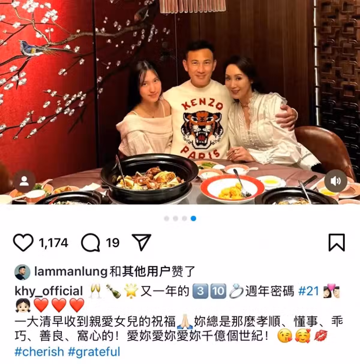 3月11日晚,郭可盈在社交平台曬出全家福慶祝結婚21周年紀念日,並配文「又一年的310周年密碼。一大清早收到親愛女兒的祝福、你總是那麼孝順、懂事、乖巧、善良、窩心的!愛你愛你愛你千億個世紀!」