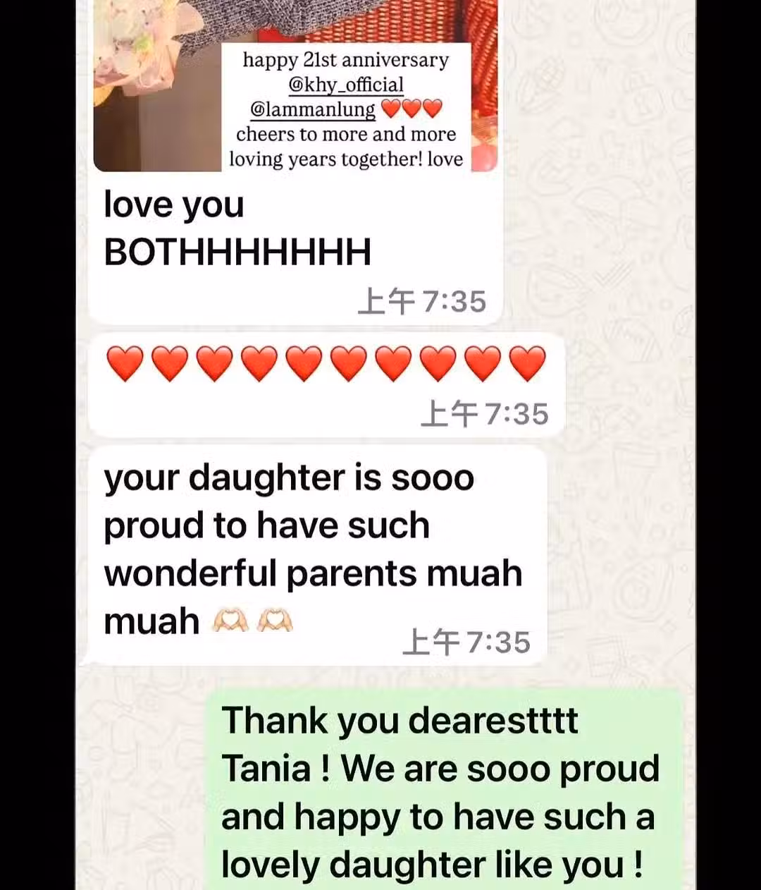 林天若非常懂事乖巧,在爸爸媽媽結婚紀念日當天一早就發信息送上祝福。女兒表示為有優秀的父母感到自豪,而郭可盈也表示因為有這麼可愛的女兒感到自豪和高興。母女倆互相表白,真的好有愛。