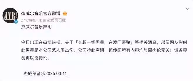 當周杰倫經紀公司3月11連發三封聲明,劃清與「澳門豪賭10億」傳聞界限時,這場娛樂圈的「猜謎遊戲」已經徹底失控。