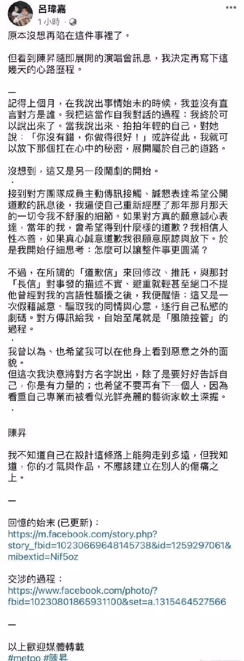 女設計師透露,在2019年被陳昇毛手毛腳,被偷摸右臉,還被握住手強迫喝威士忌,陳昇還連問她3次「你要不要跟我doi?……我開玩笑的!」接著要她喝下一瓶韓國燒酒,後來她偷偷叫網約車想逃離現場被發現,陳昇還大吼大叫威脅她。