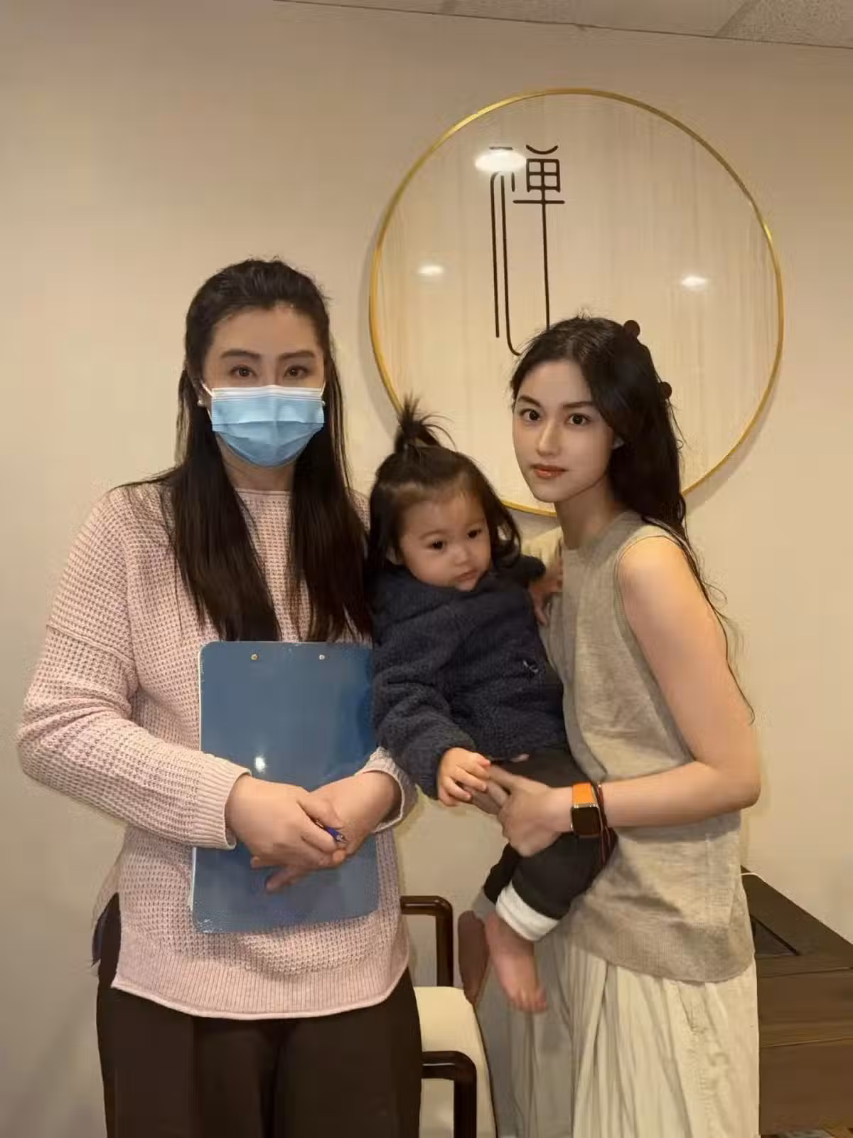 而一旁的王祖賢穿著樸素,戴著口罩,一頭長髮隨意紮起,手上拿著一本冊子,遮擋著腹部,站姿奇怪,就像店裡的工作人員。