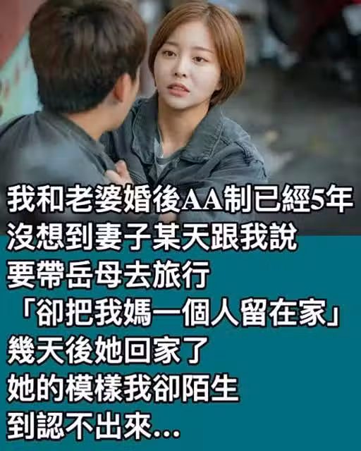 我和老婆婚後AA制已經5年,沒想到妻子某天跟我說,要帶岳母去旅行「卻把我媽一個人留在家」,幾天後她回家了,她的模樣我卻陌生到認不出來了!!