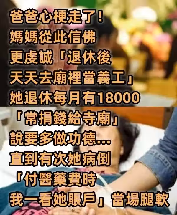 爸爸心梗走了!媽媽從此信佛更虔誠「退休後天天去廟裡當義工」,她退休每月有18000「常捐錢給寺廟」說要多做功德… 直到有次她病倒「付醫藥費時我一看她帳戶」當場腿軟
