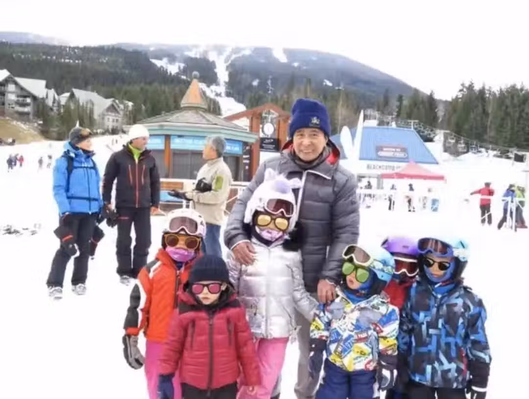還有一張更早的照片,李兆基陪著 6 個孫子孫女滑雪,李兆基摟著 孫女,牽著孫子,笑得開懷,那時候孩子們都還小,李兆基還能出門,說明是很早的一張照片了。