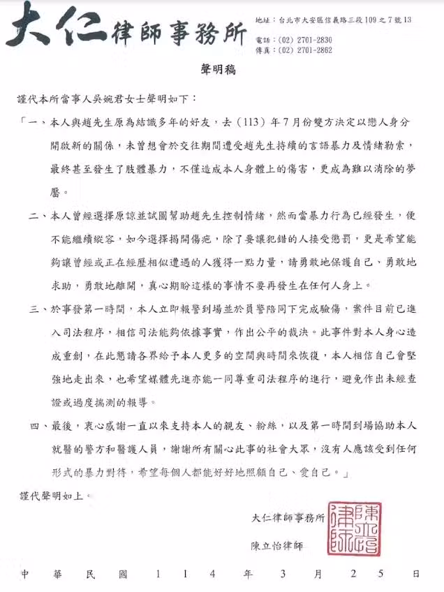 遭趙駿亞車內施暴!吳婉君報警「全身傷勢曝光」 他認了道歉:「需要被制裁」