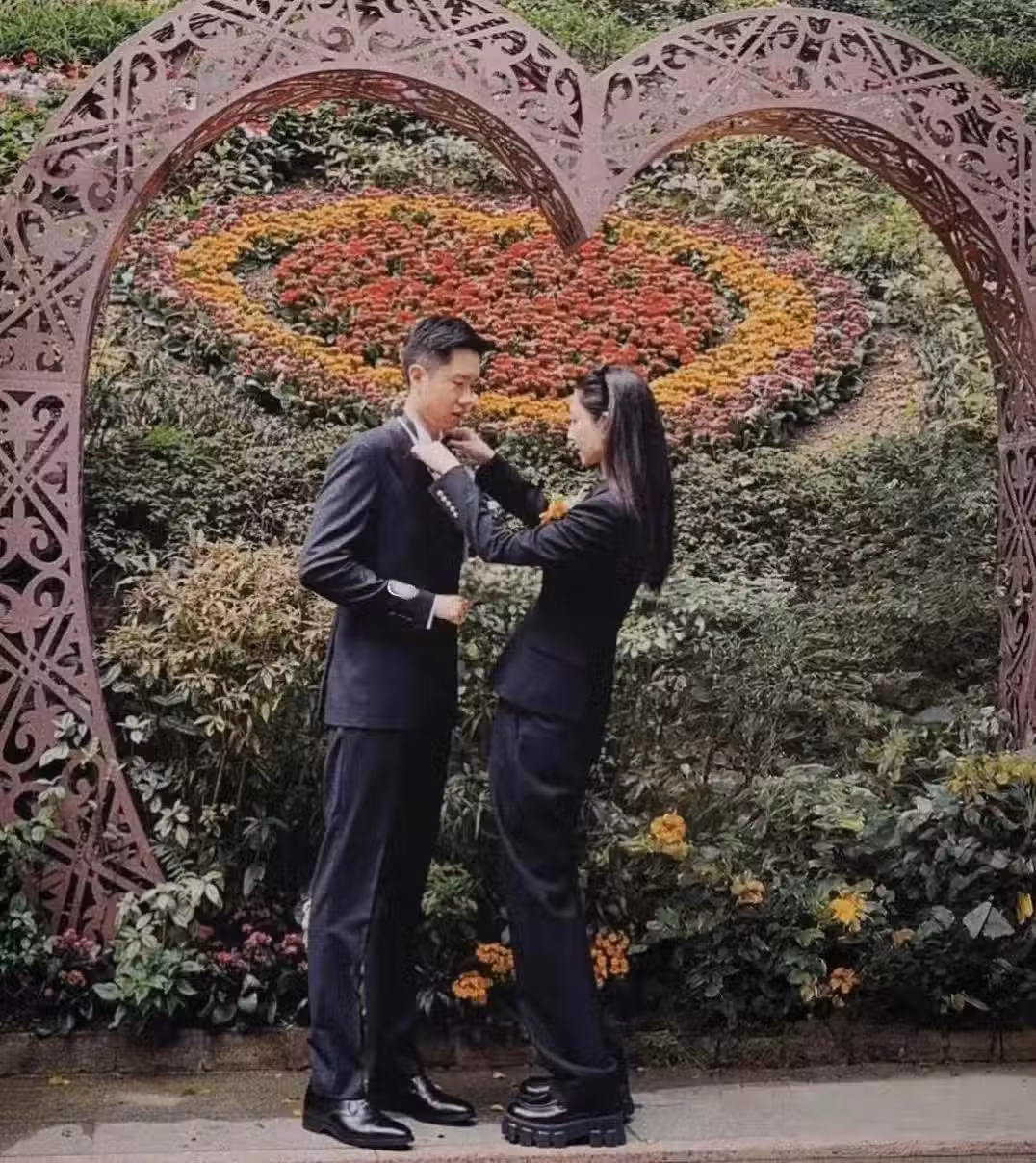 在婚禮正式開始前,姐弟倆在花牆前拍攝了合影,期間鄭希怡還幫弟弟整理了領帶,真的很貼心。-------------------