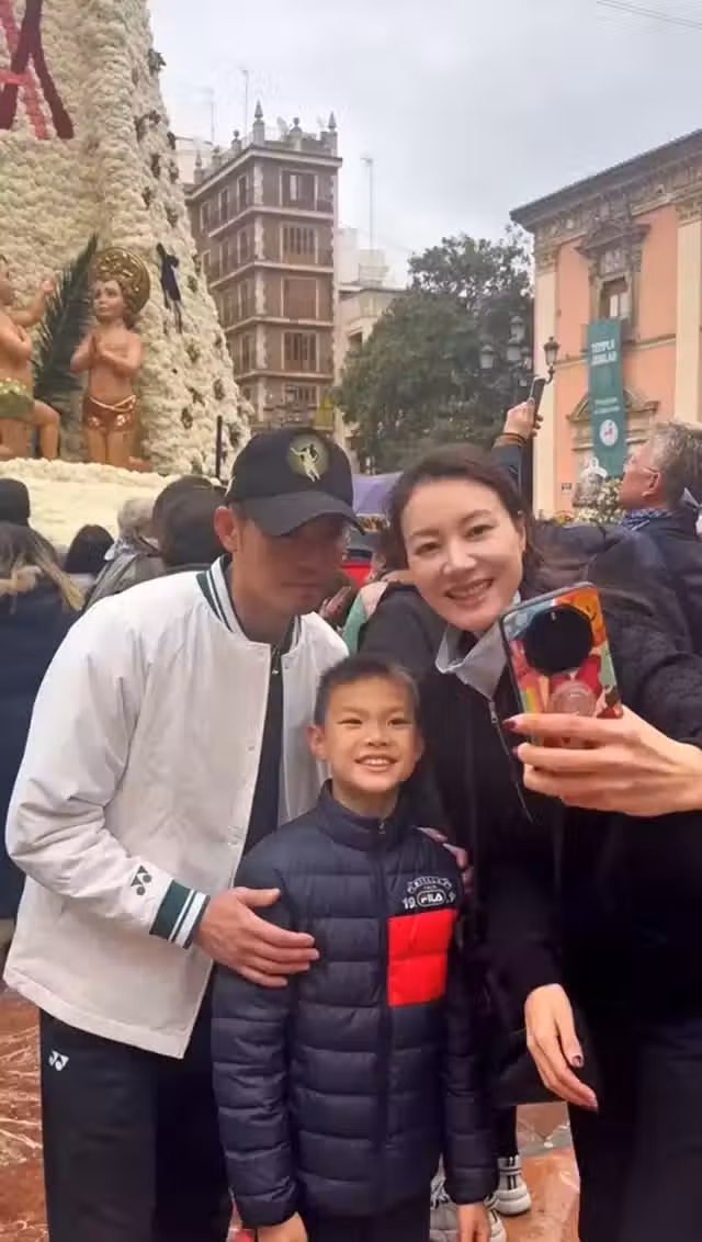 林丹曬與妻兒合照,抱著8歲兒子不撒手,與謝杏芳卻是形同陌路