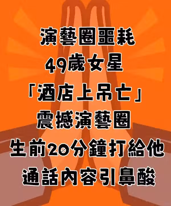 演藝圈噩耗!49歲女星「酒店上.吊.亡」震撼演藝圈 「生前20分鐘打給他...」通話內容引鼻酸