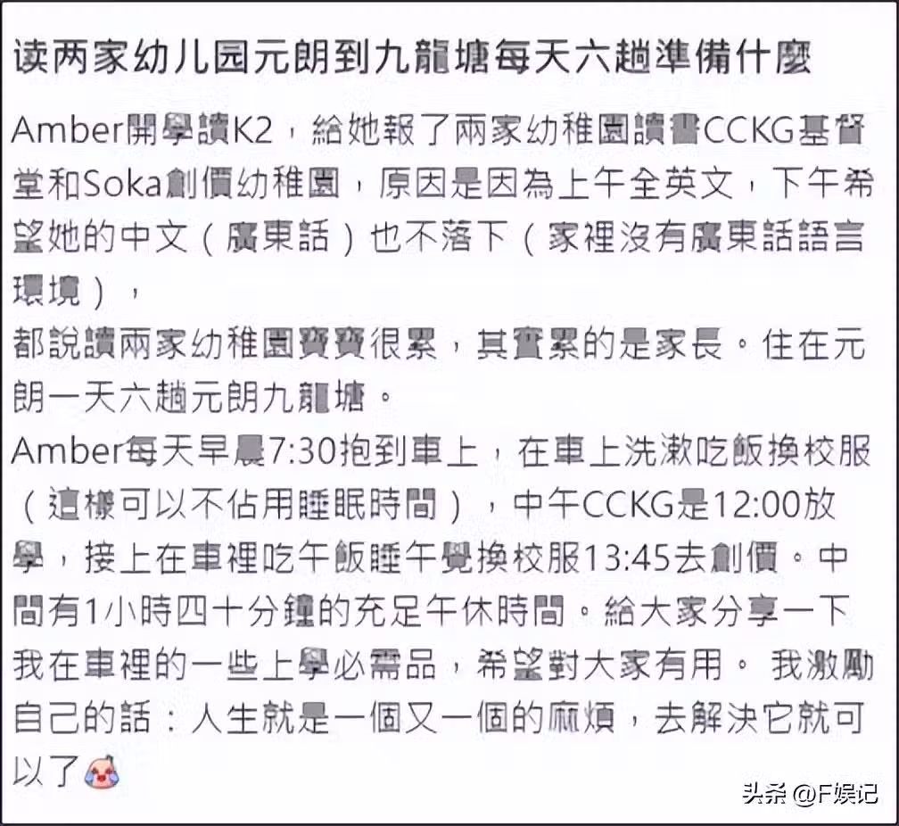 她對女兒的成長就很重視,尤其是想女兒能夠學多種語言,她曾表示女兒對粵語和普通話不太熟練,後來她竟然在女兒3歲時已經給女兒報讀兩間幼兒園。