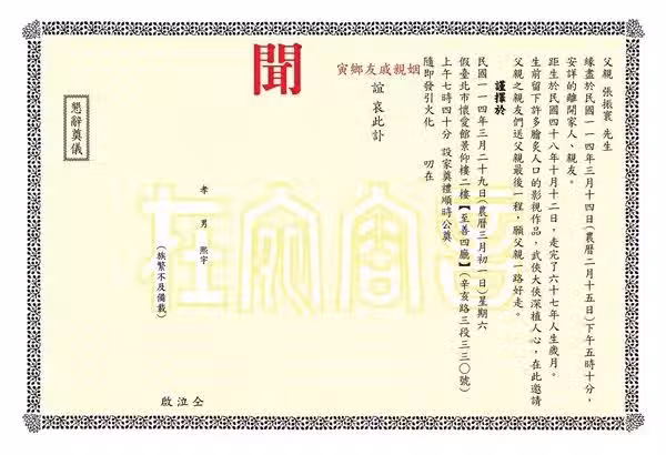 生前留下許多臉炙人口的影視作品,武俠大俠深植人心,在此邀請父親之親友們送父親最後一程,願父親一路好走」。