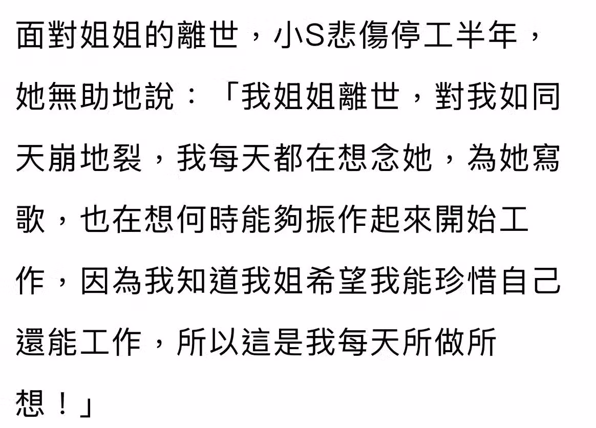 小S也首度透露失去姐姐的心情,「我姐姐離世,對我如同天崩地裂,我每天都在想她,為她寫歌,也在想何時能夠振作起來工作……」