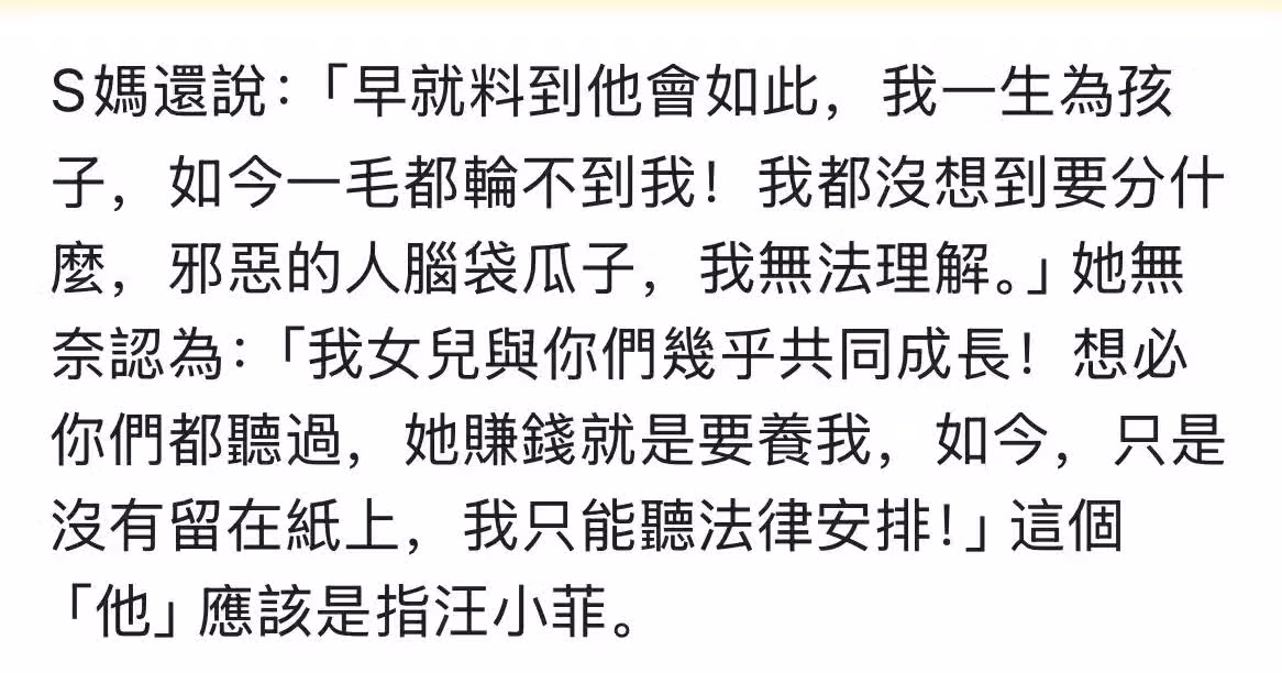 台媒認為,S媽口中的他,正是大S的前夫汪小菲。