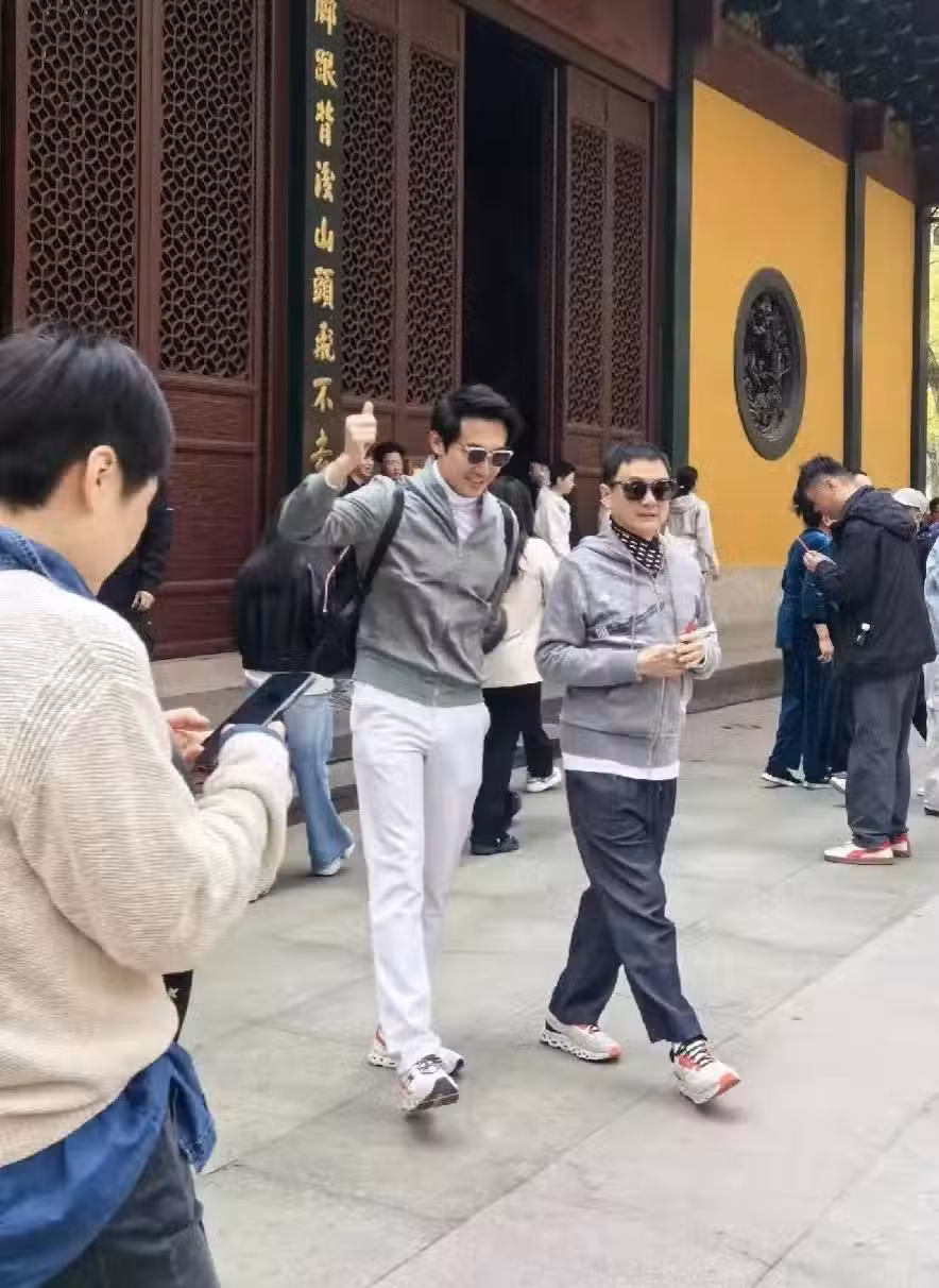 在西湖看了幾個小時的美景,他們又跟著導遊去了靈隱寺上香,張鐸還在寺廟門口拍攝了照片,看起來心情大好!