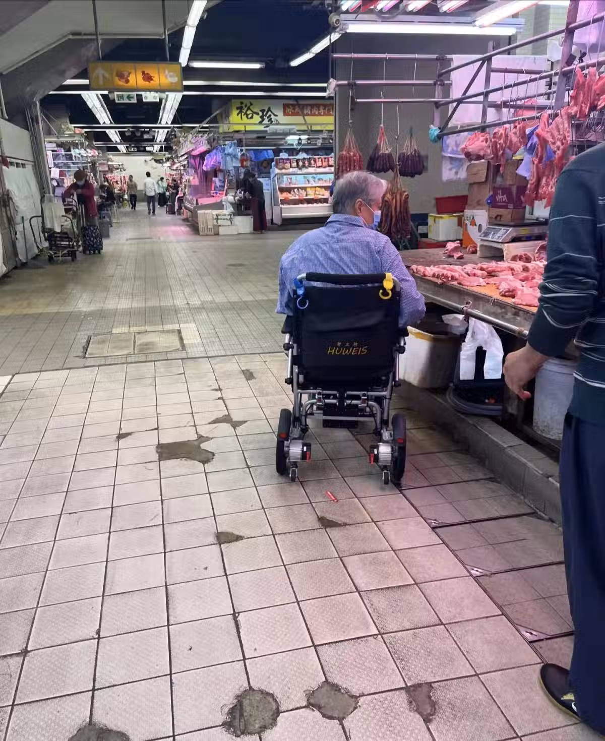 75歲洪金寶在香港,坐輪椅去菜市場,買了一塊豬肉,全程親力親為