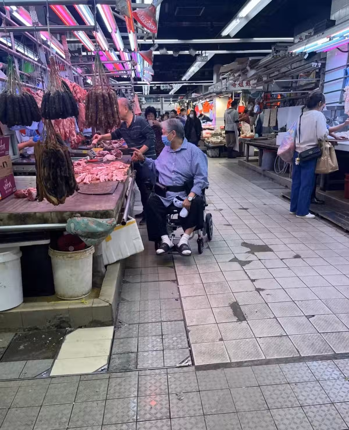 75歲洪金寶在香港,坐輪椅去菜市場,買了一塊豬肉,全程親力親為