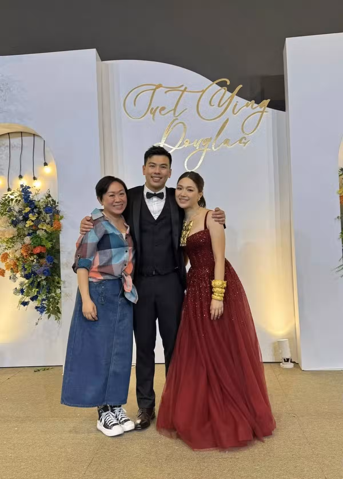 而在敬酒、敬茶的環節,她換上了暗紅色的露肩長裙,穿戴了一身的金器,只見她手上戴了四對金鐲子,其中兩對還是巨型龍鳳鐲,胸前還掛上了金牌,全身金光閃閃,格外耀眼。而她身邊的新郎全程一套西裝禮服,看起來新郎哥年輕帥氣,深得賓客們的喜愛,大家都紛紛與他合照。