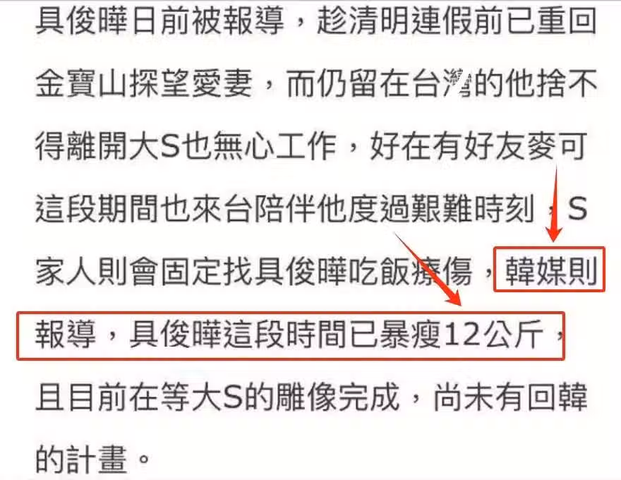 雖然說,大S遺產分配方案早已結束,具俊曄和兩個孩子均分大S遺產,有台媒曝出具俊曄至少可以獲得2億新台幣的巨額遺產。但對於具俊曄來說,似乎完全沒有心思離婚遺產一事,他依然沉浸在喪妻之痛中,韓媒更是透露具俊曄已暴瘦24斤了,嚇壞好友。