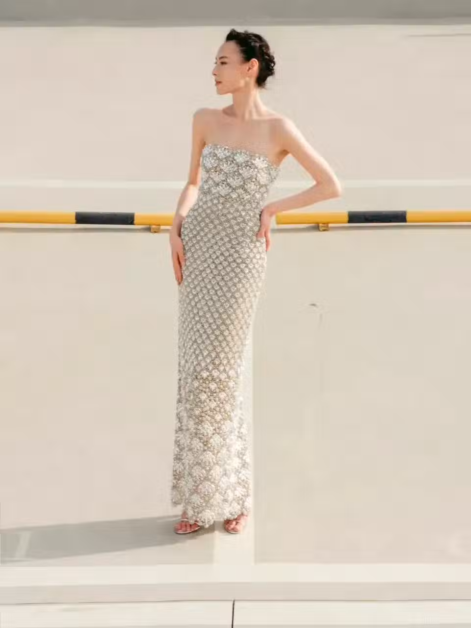 當日,梁洛施選擇了一條簡約而不失設計感的珍珠抹胸長裙亮相,貼身剪裁完美勾勒出她纖細的腰身和優越的肩頸比例,抹胸設計將鎖骨與直角肩展露無遺,搭配利落的盤發和鑽石耳飾,整體造型簡約大氣又高級,氣質這一塊真的沒得挑剔。