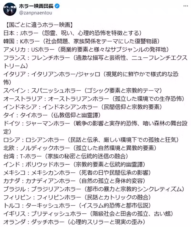以下是恐怖片團長對於每個國家拍出的恐怖片分析……