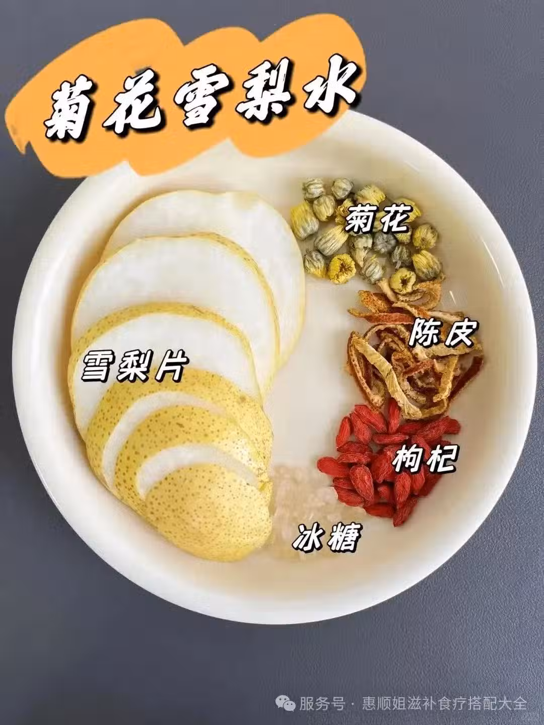 菊花3朵、雪梨1個、陳皮1克、枸杞5克、適量冰糖