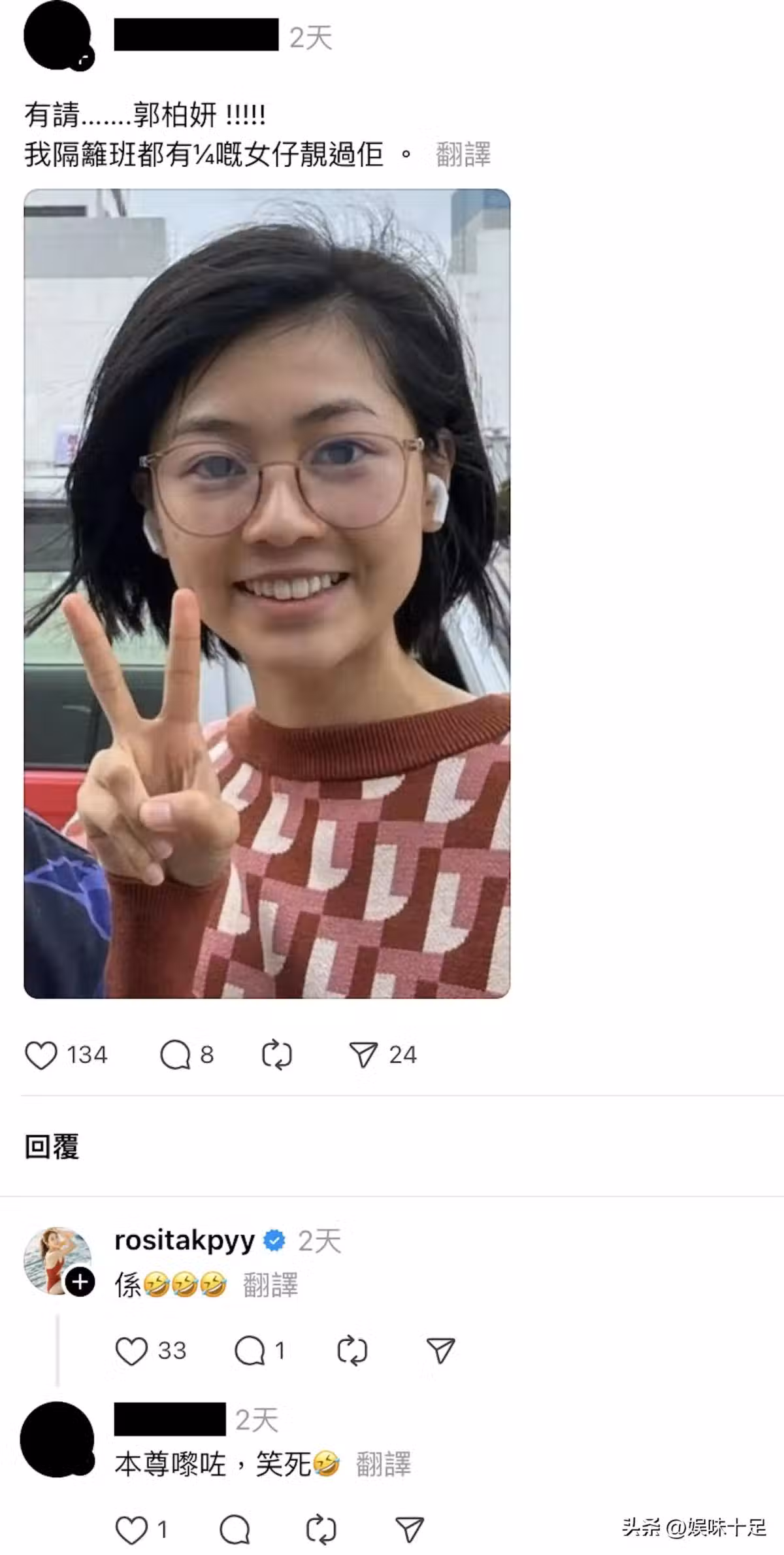 隨後又有網友貼出她的戴眼鏡素顏照,並狠狠評判說道:「我隔壁的班級裡面,有一大半的女孩比她好看。」面對如此直接的批評,郭柏妍竟然風趣回覆:「是的。」