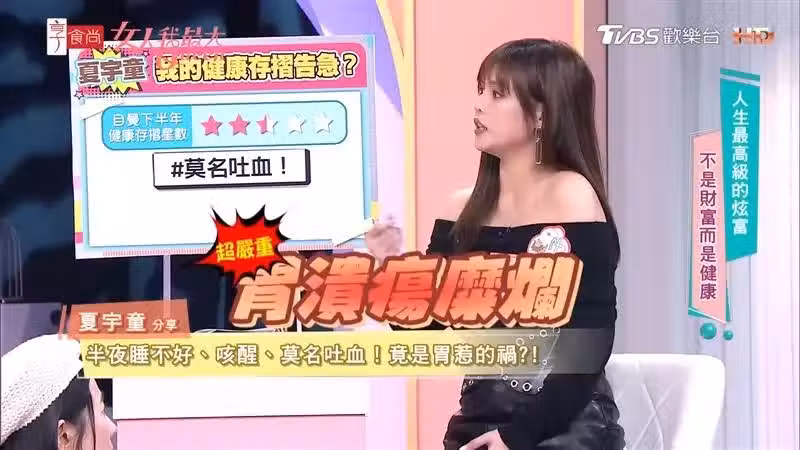 不僅鮮血噴出來,夏宇童同時感受到從胃往上到食道都有灼熱感,還痛到整個人蜷縮,嚇到身旁朋友,趕緊將夏宇童送去醫院,檢查出是胃潰瘍糜爛,且胃壁破到血管「已經要穿了」,所以前段時間睡不好,其實不是支氣管問題,而是胃酸在作怪。