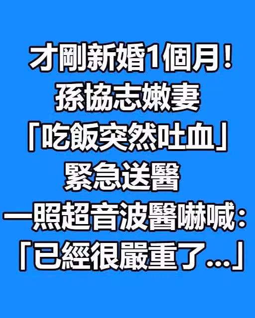 才剛新婚1個月!孫協志嫩妻「吃飯突然吐血」緊急送醫 一照超音波醫嚇喊:「已經很嚴重了…」