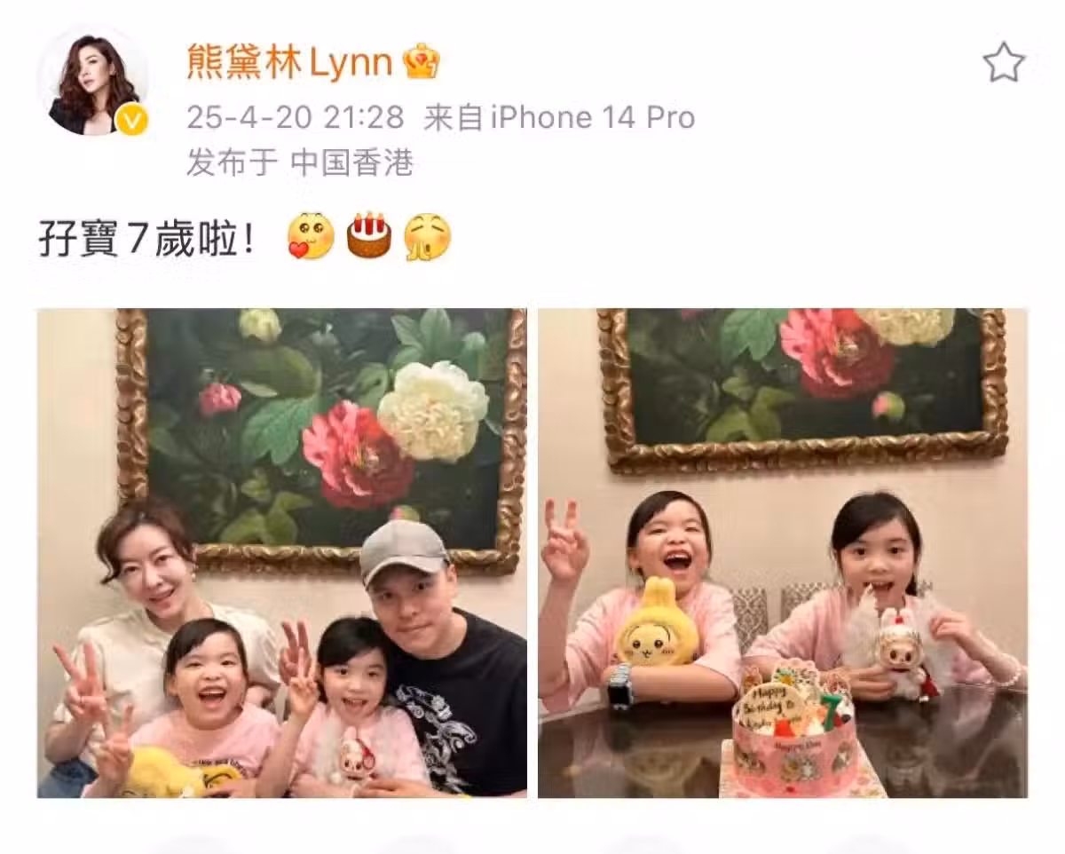 熊黛林在社交平台曬出為雙胞胎女兒慶祝7歲生日的全家福,一家四口開心同框,畫面溫馨幸福。-------------