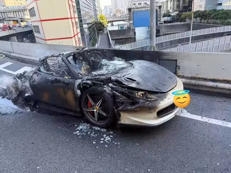 Honkon(ほんこん)表示,這台車是他存了10年的錢,終於買了夢想中的汽車法拉利,16日才交車,不料竟在一小時後,開上首都高速公路就爆炸起火,愛車直接被燒個精光,他傷心發文哀嘆:「我想我是日本唯一一個遇到這種麻煩的人。