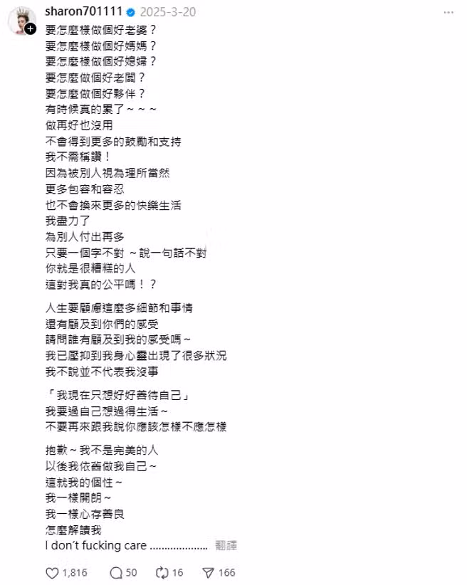 她在文末提到身心出狀況,想善待自己、過自己想過得生活,「我不是完美的人,以後我依舊做我自己,這就我的個性。我一樣開朗,我一樣心存善良,怎麼解讀我,I don't fxxking care!」雖事後她指出,只是單純抒發心情,也提到老公個性木訥直白,講的話有時雖然讓人傻眼,但並非主因,而是長久的壓抑累積所致。最後她向關心她的人表達歉意,鬆口「我們沒事的, 以後也不會再有這樣的言論了」。