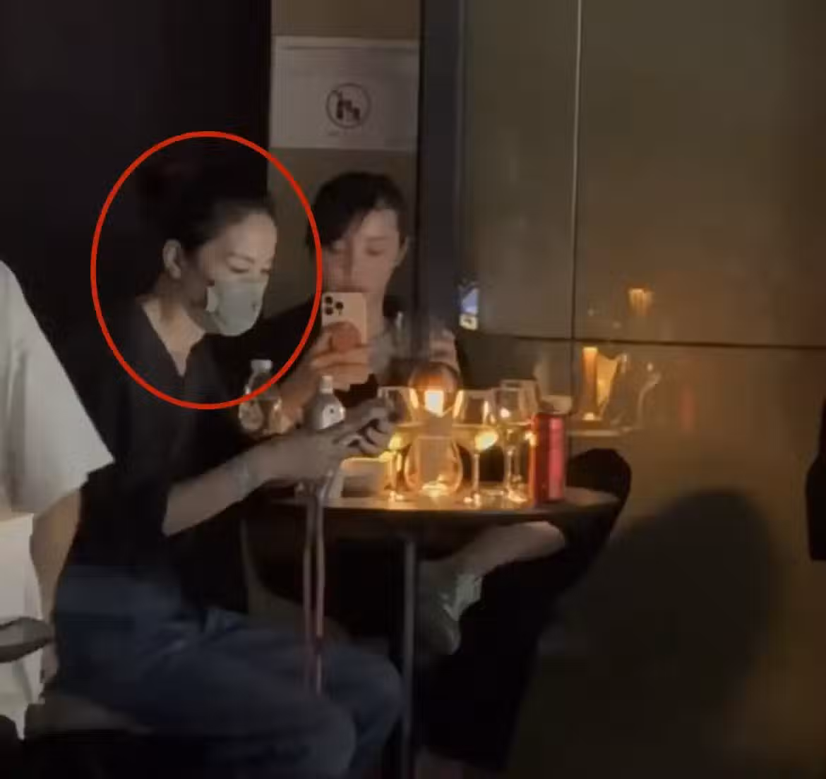 見的她與友人坐在角落,渾身黑色裝扮,戴著口罩,可能是因為忙碌,她在不斷把握手機。細看其皮膚狀態真的很好,尤其是臉部的線條感和飽滿感,一看就是那種善與生活的人。