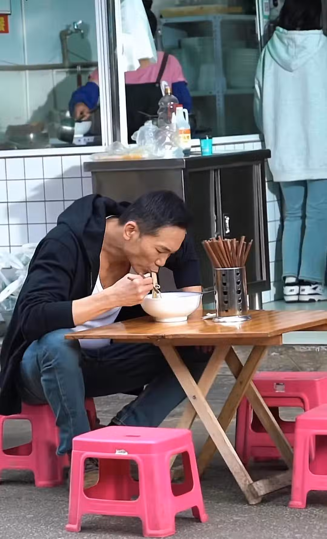 57歲知名動作明星路邊攤吃面無人識,餓到狼吞虎咽,青筋直冒