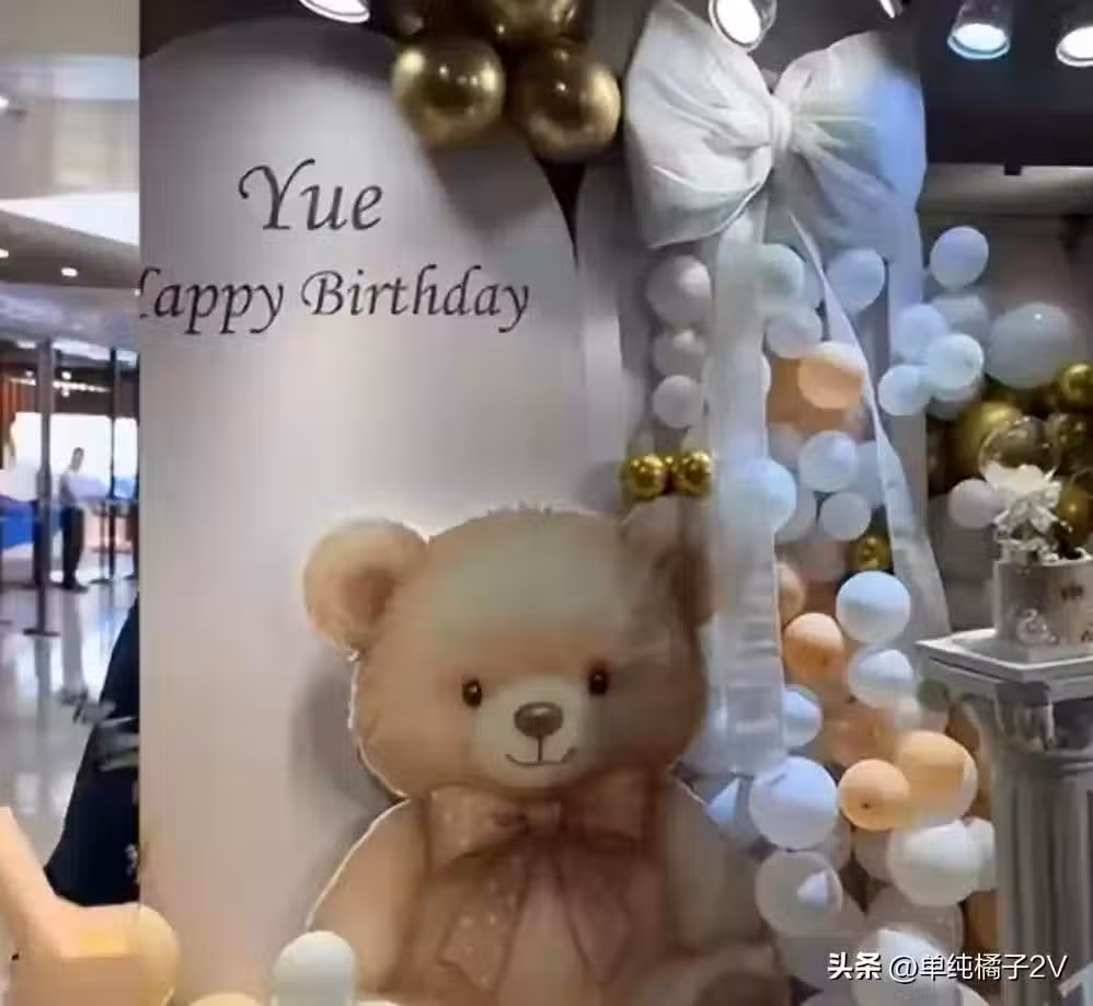 在其中一張曝光的照片中,能夠看到,小玥兒留著波浪長發,穿著白色上衣,站在布置好的主題台上,她身後寫著「Yue Happy Birthday」.