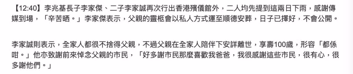李家傑表示李兆基的靈柩會以私人的方式運送至順德安葬,安葬的日子已經選好了,不會對外公開。而李家誠則表示全家都捨不得父親,他透露李兆基是在全家人陪伴下安詳離世。