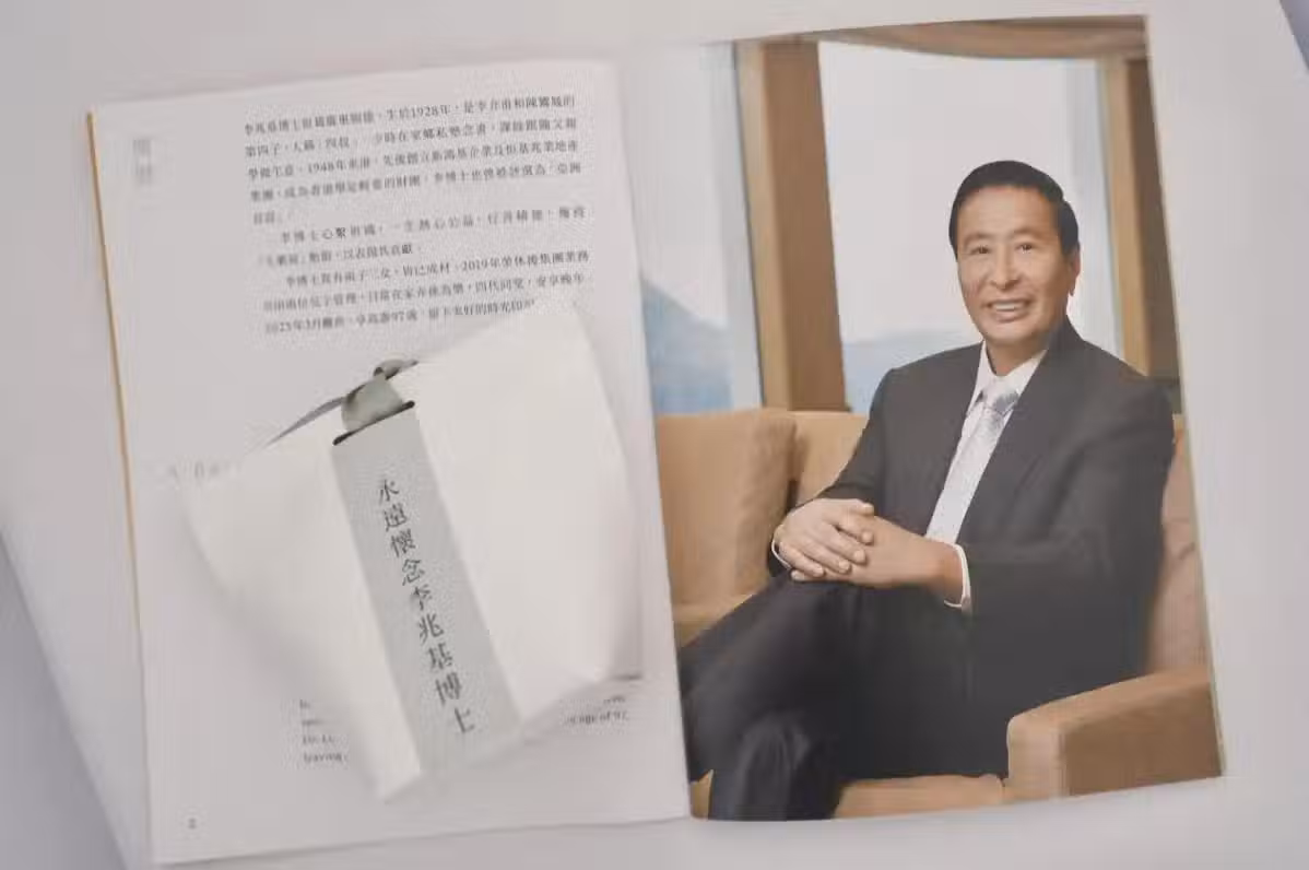紀念冊子的第一頁就是李兆基的墨寶,「上善若水,自然無為」八個字很醒目。這兩句話出自春秋時代老子,相信這是李兆基多年來的人生信條。之後,就是對李兆基生平的介紹,包括生於1928年,是家中第四子,故此稱為「四叔」。年少時李兆基在家鄉私塾念書,之後與父親做生意,1948年來香港創立了新鴻基企業與恆基兆業地產。李兆基育有兩子三女,2019年榮休後將集團交給兩個兒子打理,自己弄孫為樂,直至2025年3月離世,享年97歲。