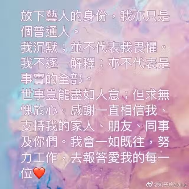 5月28日,姚子羚在個人社交平台發文稱:「放下藝人的身份之外,我也是一個普通人,我沉默並不代表我畏懼,不逐一回應並不代表就是事情的全部,世事豈能盡如人意,但求問心無愧,感謝所有相信我的粉絲和朋友。」