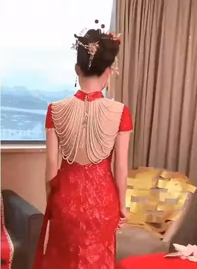 視訊中的新娘身著傳統紅色旗袍,背影優雅婀娜,瞬間吸引了現場賓客和網友們的目光。
