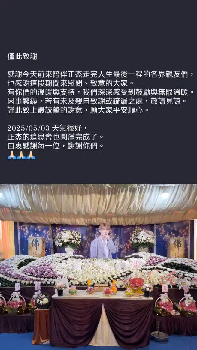 因事繁縟,若有未及親自致謝或疏漏之處,敬請見諒。謹此致上最誠摯的謝意,願大家平安順心。2025/05/03天氣很好,正傑的追思會也圓滿完成了。由衷感謝每一位,謝謝你們。」