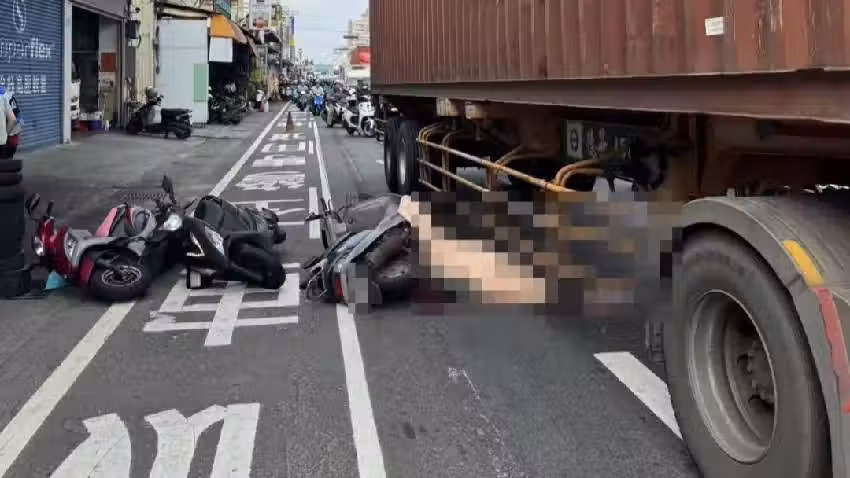 亡命瞬間曝光!連人帶車遭貨櫃車輪輾過 當場爆頭死亡!20多人目睹不敢撇頭