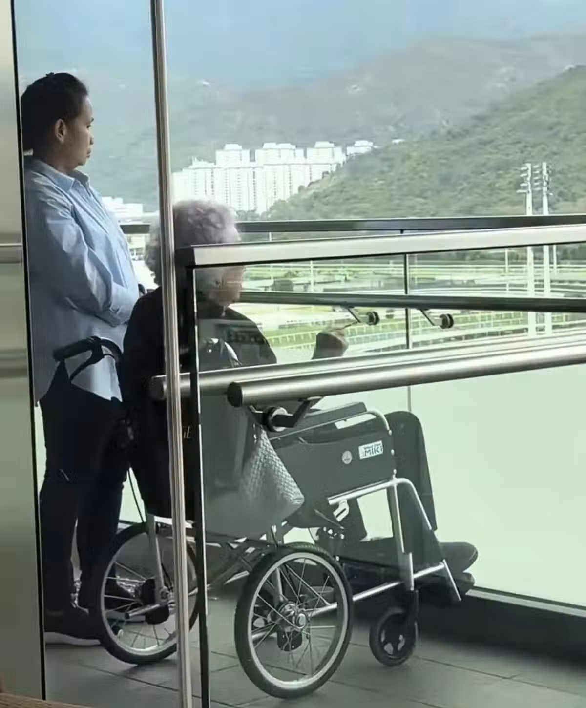 林建岳百歲母親看賽馬,坐輪椅叼煙出鏡,打扮體面滿頭白髮好顯眼