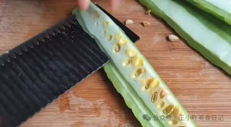 把洗乾淨的苦瓜撈出來,放在案板上。用刀將苦瓜的頭尾去掉,然後將苦瓜對半切開,再進一步分成四等份。接下來,用自己喜歡的方法把苦瓜的瓤去掉,因為瓤是苦瓜的重要苦味來源之一。