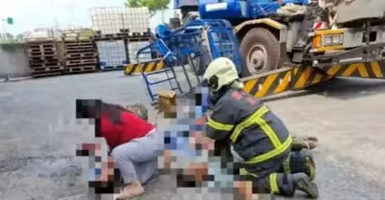 當時吊車準備要將4名工人送上去,執行高空弔掛作業,沒想到吊臂突然斷裂,在吊車上的4名工人被重摔,傷勢嚴重。