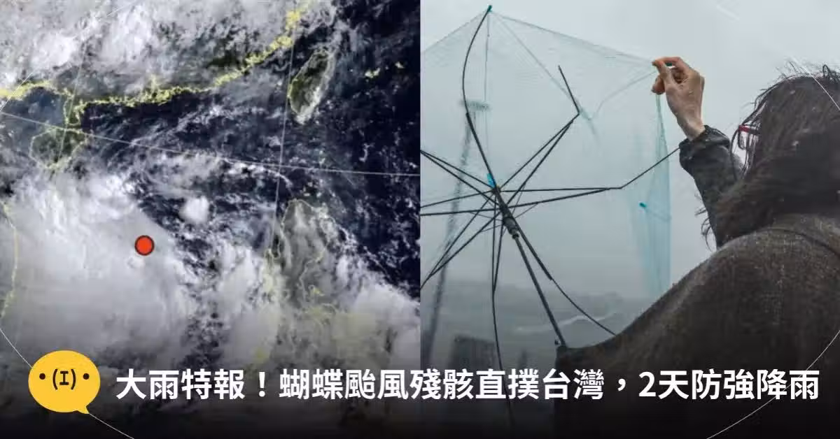 今年首台「蝴蝶」雖然本身對台灣直接影響的程度小,但蝴蝶颱風的「殘骸」卻意外重創台灣,升級為另一個熱帶性低氣壓,直撲而來!豪大雨傳出災情,高雄處淹水,許多地區已宣布停班停課。