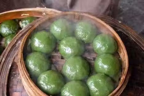 艾葉糍粑:艾草洗凈後,切成碎末,和著蒸熟的顆粒狀山芋粉、糯米一起舂搗,形成黏狀物,再捏摶成一個個渾圓溫潤、綿軟柔嫩的艾葉糍粑,放蒸鍋上蒸熟,即可食用。
