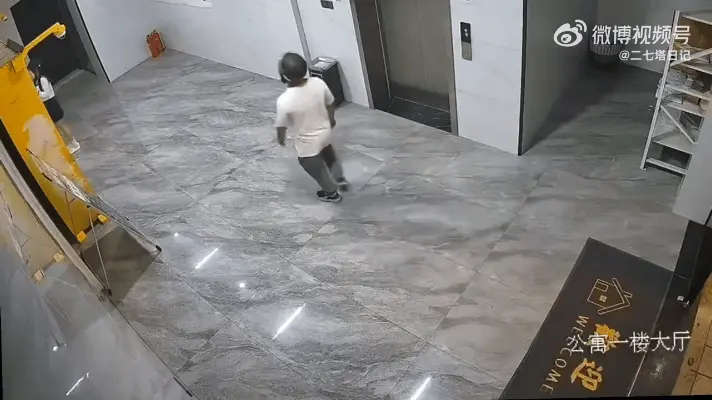 穿著短裙的女孩慢慢走到電梯廳,看周圍的裝修這個小區應該不算那種老破小,打掃的非常乾淨,進出還有感應門。就在這時,一個帶著頭盔的男人突然闖入監視器鏡頭,完全無視第一個電梯