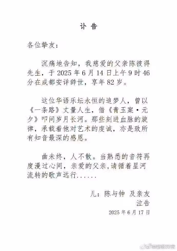 兒子近日發訃聞證實陳彼得過世的噩耗,指父親於6月14日上午9點46分在成都安詳辭世,享壽82歲。